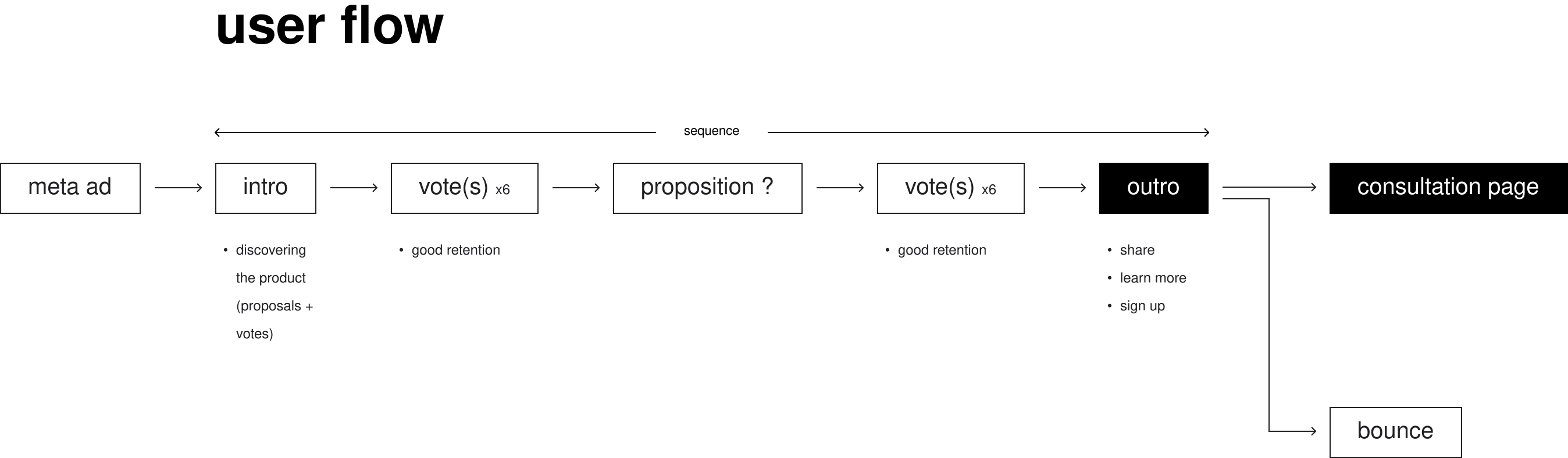 Our user journey begins with acquisition campaigns, primarily through Meta ads, that drive users to what we call "the sequence." In this sequence, participants vote on 12 proposed solutions, submit their own ideas if they wish, and are then presented with several paths forward at the end of the flow—the Consultation Page being one of them.